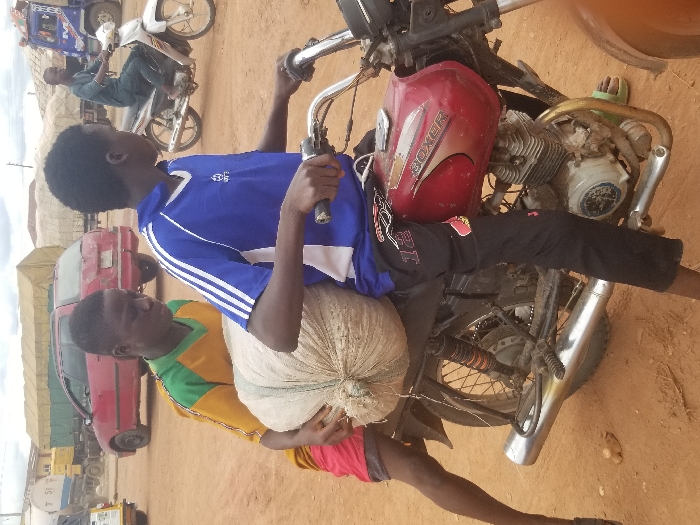 The image depicts an outdoor scene on an unpaved, reddish-brown dirt surface in the city of Adonkolo, Nigeria, under an overcast sky. In the foreground, two young males are positioned on a red utility motorcycle. The male in the driver's position wears a blue and white short-sleeved shirt, black track pants, and green sandals, with his hands on the handlebars and his head turned to his right. A silver mobile phone is resting on the motorcycle's red fuel tank, which bears "BOXER" branding. Behind him, a younger male, dressed in a yellow and green short-sleeved shirt and red shorts, is seated, holding a large, light-colored woven sack between himself and the driver. His gaze is directed downwards. In the mid-ground, a male rider on a white scooter-style motorcycle is moving from right to left. The background features a red station wagon and multiple large commercial trucks, some covered with tarpaulins, indicative of a transport or commercial area.