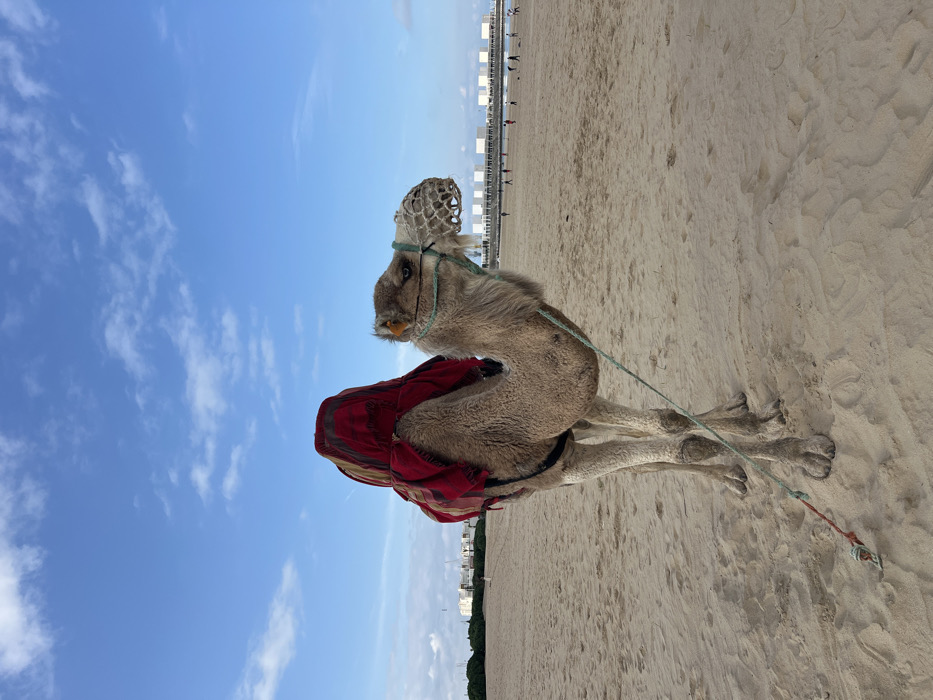 - "A light brown dromedary camel stands prominently on a sandy beach, positioned slightly left of center and facing right" by FM-Gn7EC2, licensed under CC BY 4.0