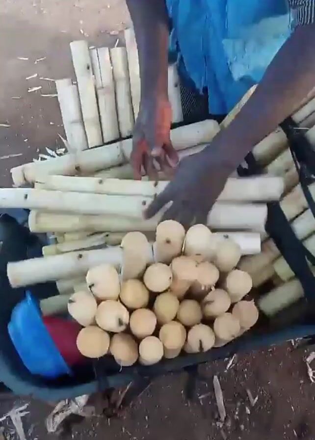 A man wearing a blue vest and a Star Wars hat is arranging sugarcane in a wheelbarrow. The wheelbarrow is filled with whole sugarcane stalks, sugarcane cut into short segments, and round peeled sugarcane pieces. There are a few plastic bowls in the wheelbarrow as well. The man's hands are visible as he moves the sugarcane. The ground is dirt. In the background, several people walk on a dirt path in a hazy outdoor setting.