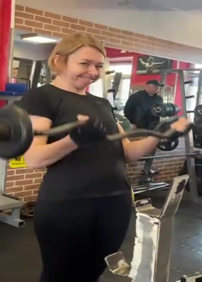 A woman in a black athletic outfit is doing bicep curls in a gym