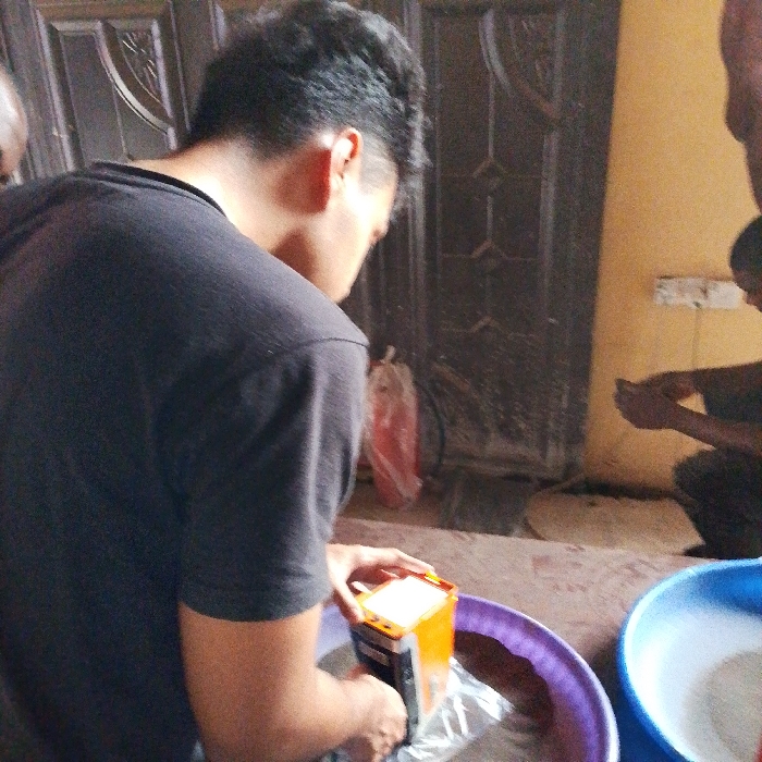 - "A person in a dark t-shirt pours contents from an orange and black container into a purple bucket with sand" by FM-kquCH2, licensed under CC BY 4.0