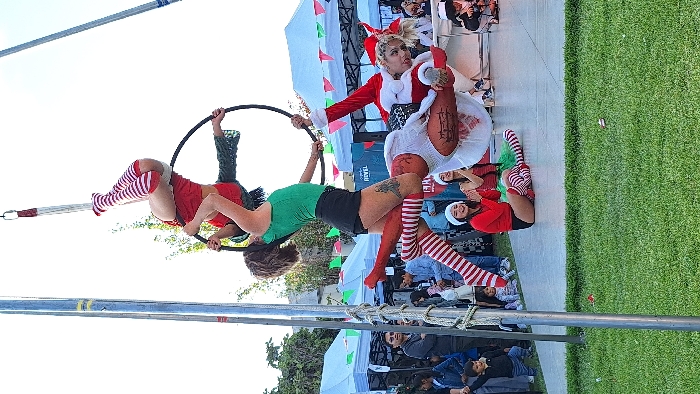 Two female acrobats perform suspended from a hoop. One wears a green top and black shorts while the other sports a red outfit with striped stockings. A third performer dressed as Santa Clause balances on a seated individual clad in white. The audience below observes. Several individuals in elf attire pose on the ground near a patch of green grass. Tents and various banners are in the background.