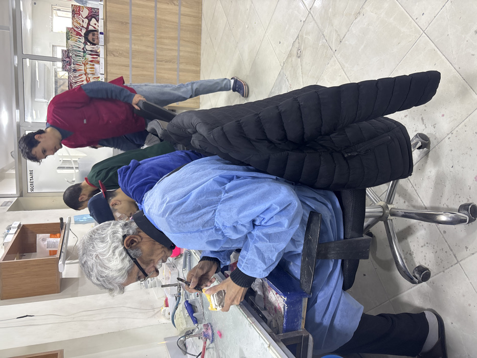 This image depicts an indoor dental laboratory or workshop located in Fez, Morocco