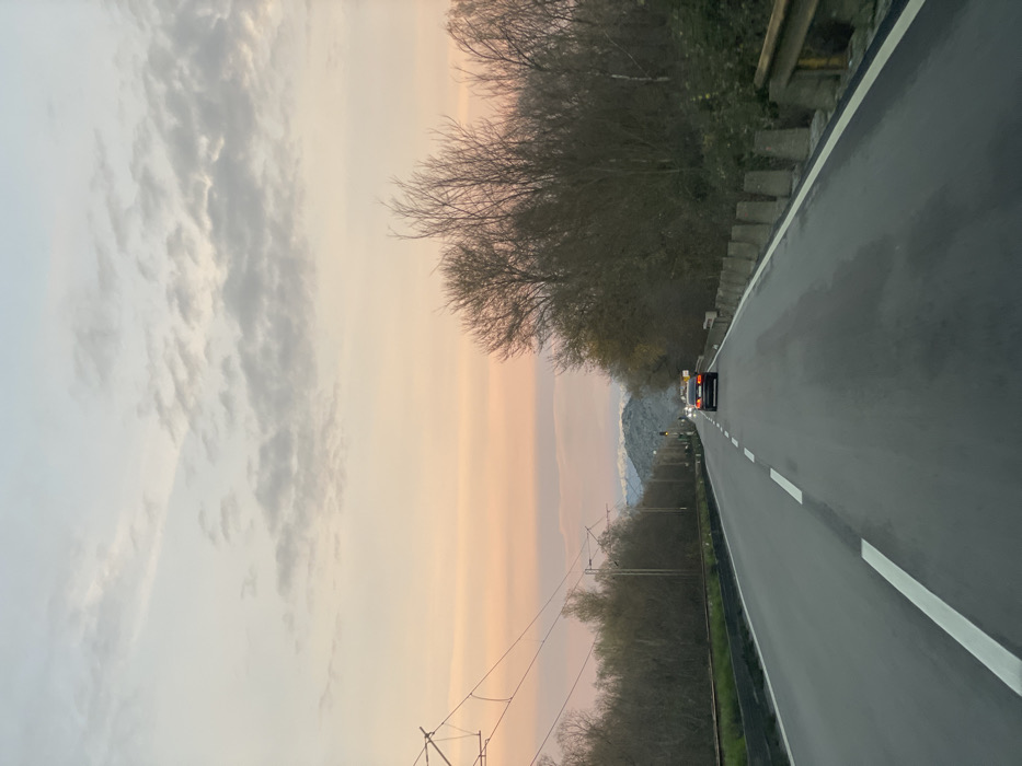 An asphalt road curves slightly ahead with dashed white lane markings. A black car with lit tail lights travels in the distance. Bare trees line the road, meeting a concrete barrier on one side and power lines on the other. A light pink and orange sunset sky dominates the background with clouds and the outline of a snow capped mountain in the distance.