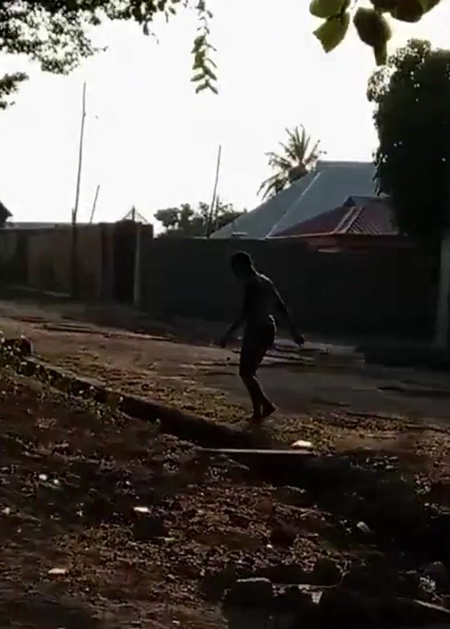 A person in shorts and no shirt walks down a dirt road toward another person, who then throws something at them, and they fall into a ditch