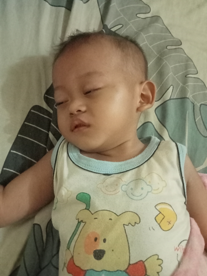 - "A baby sleeps peacefully on a patterned bed" by FM-5geVz2, licensed under CC BY 4.0
