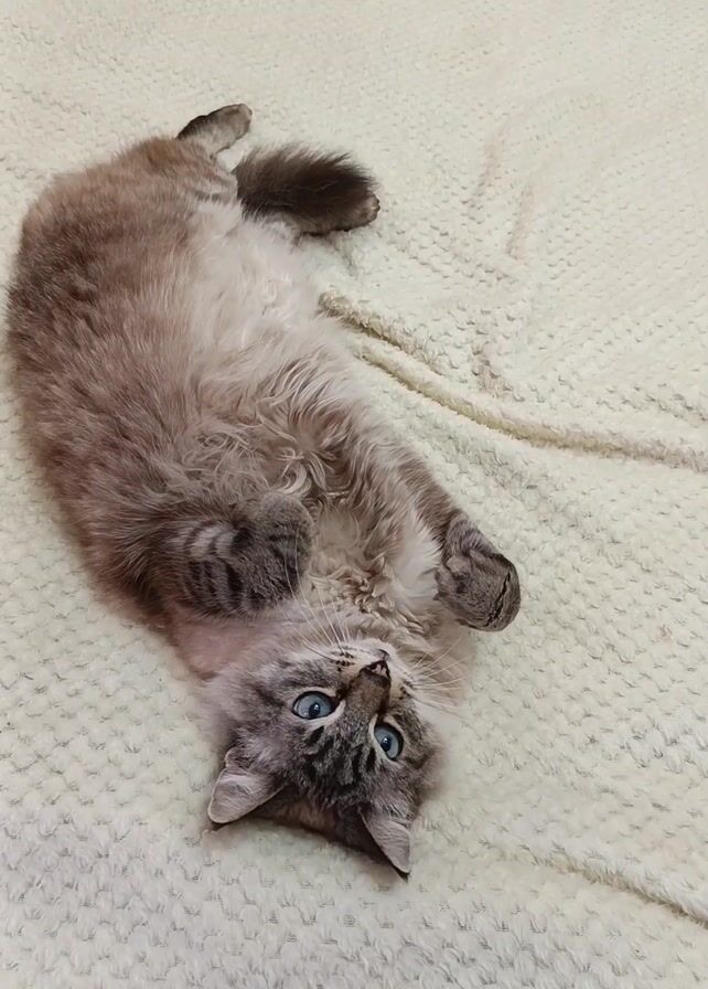 A long-haired tabby cat with blue eyes is lying on its back on a light-colored textured blanket