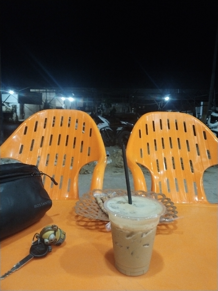 This image depicts a nighttime outdoor scene at an establishment in Keudebayu, Indonesia, viewed from a seated perspective. In the immediate foreground, an orange plastic table surface occupies the lower half of the frame. On the left side of the table, a black "BOSTANTEN" branded sling bag rests next to a set of keys attached to a yellow Minion character keychain. To the right, a clear plastic cup filled with an iced coffee beverage, complete with a black straw, stands prominently. Behind the drink, a light-colored woven plastic basket contains a snack, possibly wrapped in clear plastic. In the midground, two matching orange plastic chairs with slatted backs are visible, positioned as if facing the table from the opposite side. The background is dark, indicating night, with several artificial lights illuminating structures and what appear to be parked motorcycles.