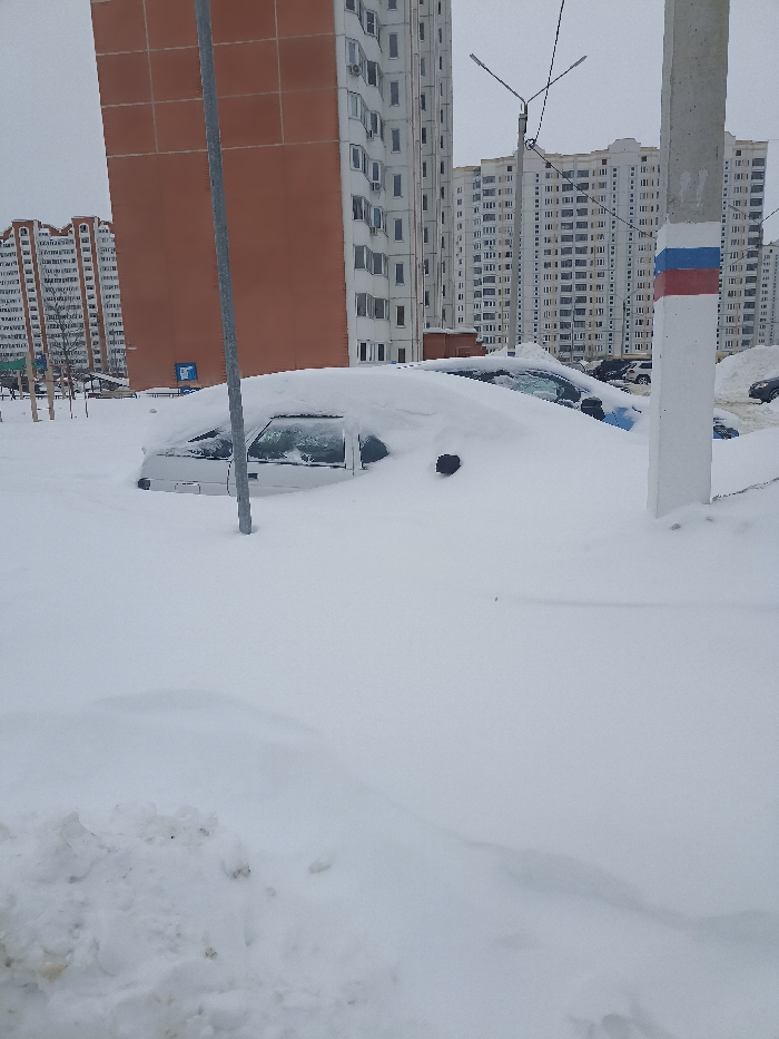 The scene depicts a snow-laden urban residential area in Serpukhov, Russia, under an overcast sky. Deep, undisturbed white snow covers the ground, accumulating significantly over objects. In the midground, a light-colored sedan (possibly silver or white) is almost entirely buried, with only the upper portions of its side windows, roofline, and a black front passenger door handle visible through the snow. Behind it, a darker vehicle is also heavily obscured by snow. A grey metallic pole rises vertically in front of the light-colored sedan, while a concrete utility pole, marked with horizontal red, white, and blue stripes (Russian flag colors), stands to the right. The background features multiple multi-story residential apartment buildings. A prominent brown-orange high-rise with numerous windows dominates the left-center background. To its right, several taller, light-colored high-rise buildings with repetitive window and balcony patterns extend across the horizon, consistent with modern Russian urban architecture. A street light with two horizontal arms is positioned in the upper midground. A blue sign with white symbols is faintly visible near the base of the brown-orange building. No individuals or active interactions are observed in the image; the environment appears dormant under heavy winter conditions.