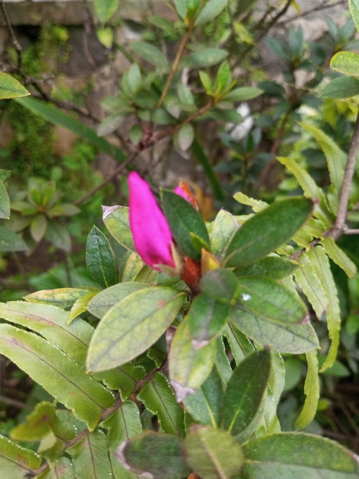 A close-up vertical photograph, taken in Tecuci, Romania, depicts a single, prominent, fusiform magenta flower bud, positioned slightly left of the central vertical axis, against a backdrop of blurred green foliage and a textured, moss-covered stone wall. The bud, approximately 2-3 cm in length, is vibrant pink, with its tip pointing upwards. It is surrounded by dark green, elliptical leaves, exhibiting minor purple-brown discoloration on some edges. Further out, lighter green leaves with serrated margins are visible. The background consists of densely blurred green vegetation and a partially obscured, light gray stone wall in the upper left quadrant. No individuals or actions are present in the scene. The lighting appears diffuse and natural.