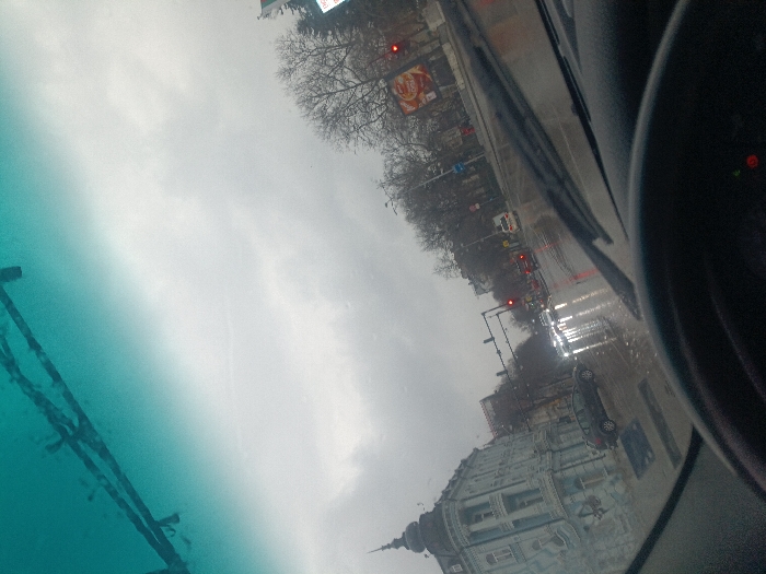 The image depicts an urban street scene in Varna, Bulgaria, specifically at the intersection of Knyaz Boris I Boulevard and Knyaz Alexander Batenberg Street, looking eastward. The distinctive building on the left with a prominent corner turret and multiple ornate windows is the Hotel Musala Palace. The scene is viewed from inside a vehicle through a wet windshield, indicating rain or recent precipitation. The sky is overcast and uniformly gray. The road surface is wet and reflective, showing streaks of light. Multiple vehicles are present on the street; headlights from oncoming traffic are visible, forming bright streaks. Traffic appears to be stopped or moving slowly, as indicated by visible red traffic lights. In the foreground, the top edge of a vehicle's dashboard and a portion of the steering wheel are visible at the bottom of the frame. A windshield wiper is present on the lower right of the windshield. On the right side of the street, bare deciduous trees line the sidewalk, and a large billboard featuring a "Happy Bar & Grill" advertisement is partially visible. Beyond the intersection, additional buildings and more traffic are discernible. The overall impression is an active city environment during inclement weather.