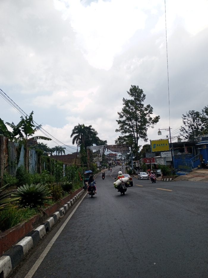 This image depicts a street scene in the city of Multhan, India, under an overcast sky. The asphalt road, appearing damp, extends into the distance, gently ascending and curving to the right. On the left side, a black and white curb borders a strip of dense green vegetation, including broad-leaf plants and bushes. Behind this foliage, a corrugated metal fence or wall is visible, partially obscuring residential structures. Overhead power lines are present in the upper left. On the right side of the road, a tall coniferous tree stands prominently. Further along, commercial buildings feature signage, including a yellow sign displaying "SANYA" and other text. A large, ornate metal archway spans the road in the mid-ground. A street light fixture is mounted on a pole on the right. A tall, thin vertical antenna or pole extends from the right side towards the top of the frame. Traffic on the road primarily consists of motorcycles. In the foreground-midground, a motorcyclist in dark clothing is visible in the left lane, proceeding forward. Center-right, another motorcycle is heavily laden with large, white, wrapped bundles or sacks; its helmeted rider wears a light-colored top. A light-colored sedan follows this motorcycle. On the right side of the road, a helmeted motorcyclist in a light-colored top is traveling towards the viewer. Additional motorcycles and at least one car are observed further down the road, moving in both directions. A single individual is partially visible seated near a blue structure on the far right.