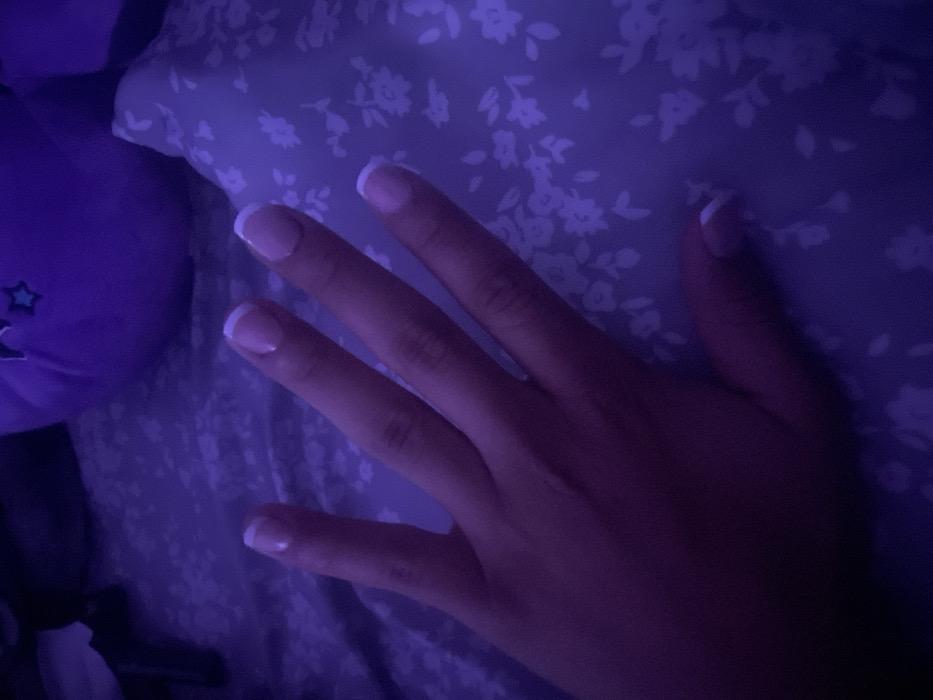 A hand with French-manicured nails rests on a patterned fabric, possibly a bedsheet. The background features small floral designs in a light color against a darker backdrop. To the left, a plush object with a star is visible. The image is bathed in a purple or blue-ish hue, possibly from artificial lighting, which makes the details somewhat obscured.