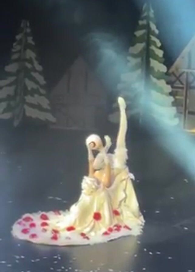 On a stage, a performer in a white dress with red rose petals on the train is doing a handstand