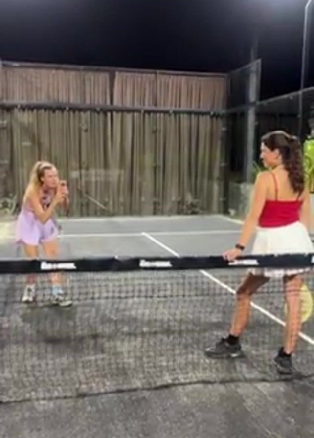 Two young women are on a paddle tennis court at night. One of the women is standing behind the net, wearing a red top and a white skirt, posing for a photo. She has her hair pulled back in a ponytail. The other woman is on the other side of the net, holding a phone and taking pictures of her friend. She is wearing a lavender top and shorts. The court is well lit and has a dark-colored surface. There is a green curtain in the background and black walls.