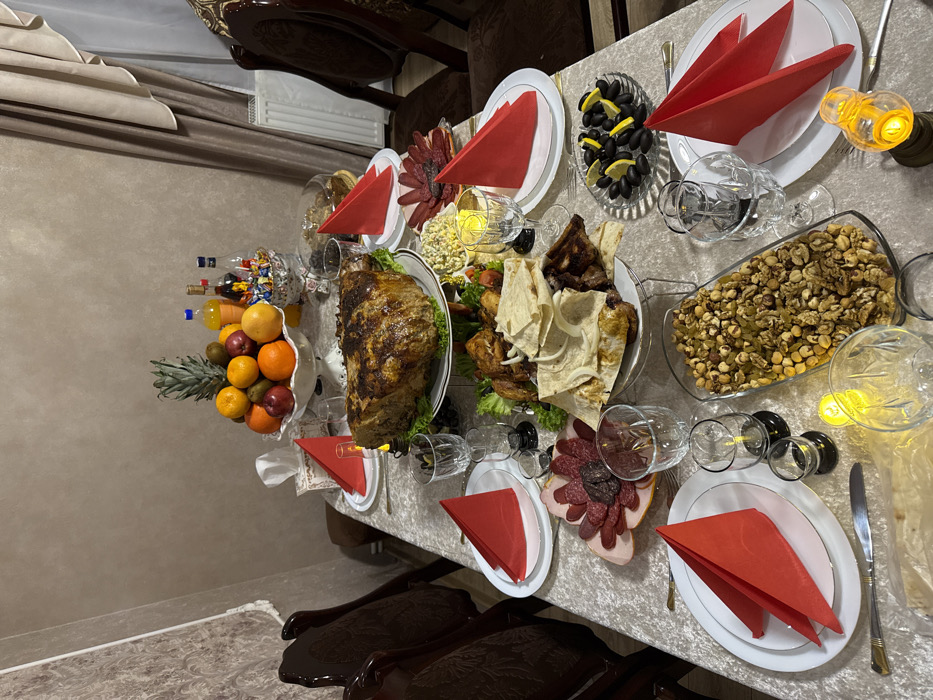 - "A lavishly set table displays a variety of dishes, including a large roast, platters of olives, nuts, and assorted meats" by FM-LKUBm1, licensed under CC BY 4.0