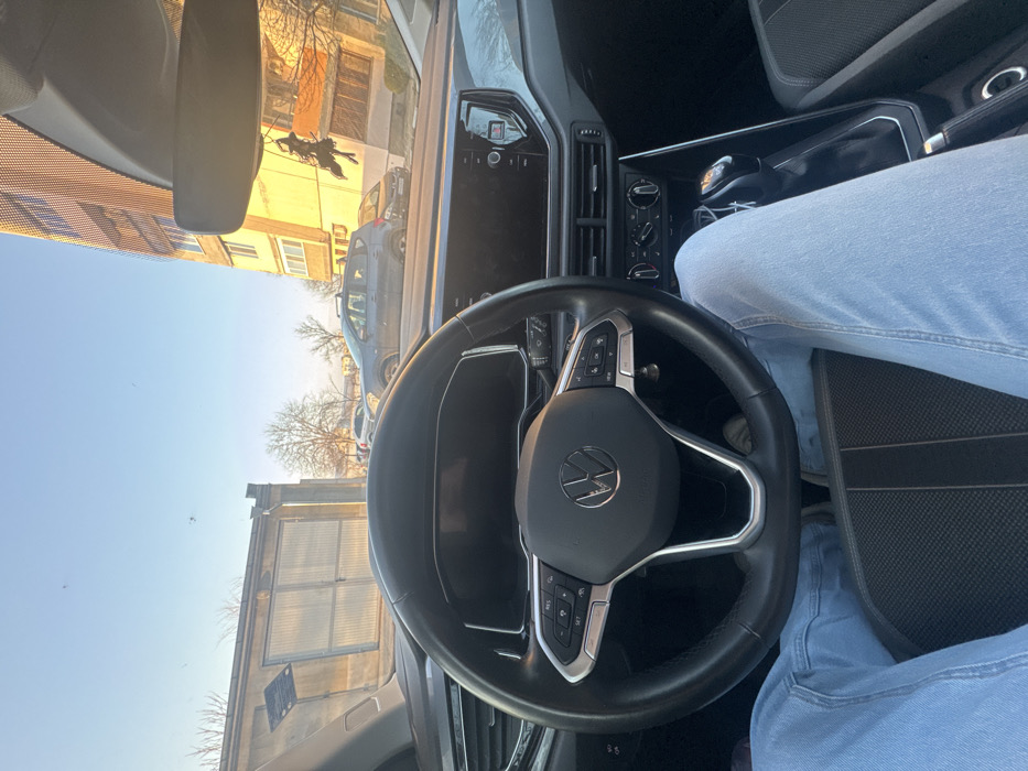 The image depicts an interior view from the driver's seat of a Volkswagen vehicle, parked in Pleven, Bulgaria, looking forward through the windshield