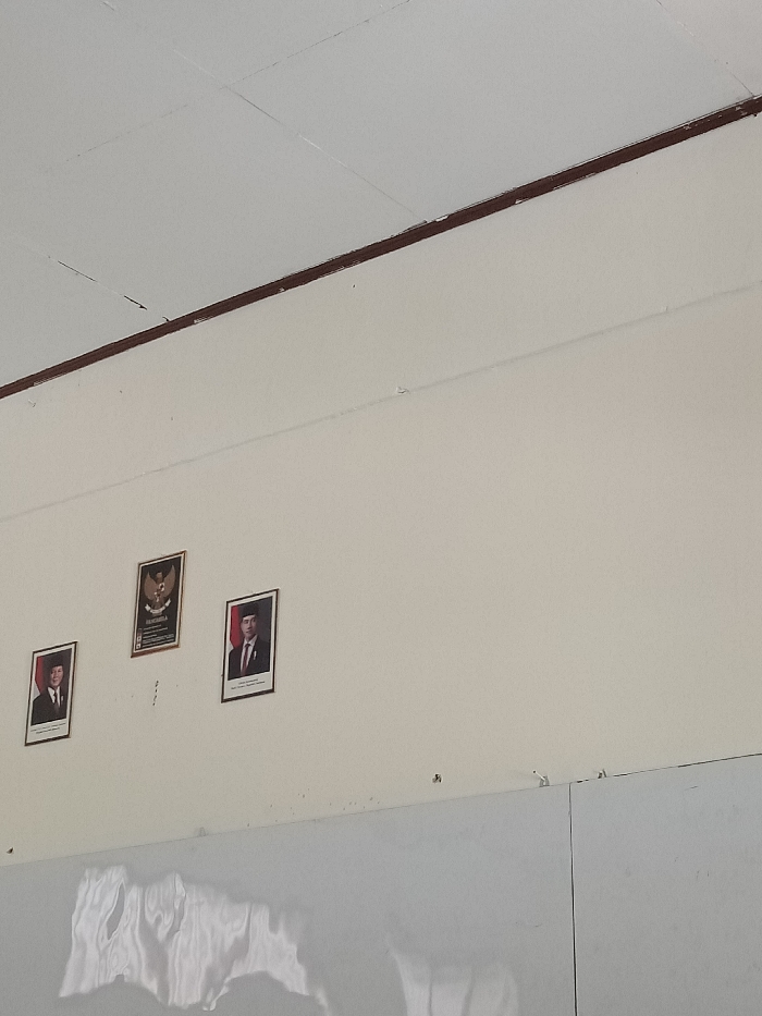 The image depicts an indoor scene within a building in Ciwalen, Indonesia. A light-colored wall, possibly cream or off-white, extends from the lower frame upwards, meeting a white ceiling characterized by visible panel seams. A dark brown trim or molding separates the wall from the ceiling along the top edge. Three framed items are mounted horizontally on the wall: a portrait of Joko Widodo, the President of Indonesia, on the left; the national emblem of Indonesia, Garuda Pancasila, in the center, with "PANCASILA" text visible below it; and a portrait of Ma'ruf Amin, the Vice President of Indonesia, on the right. All portraits depict men in dark suits with white shirts and red ties. Below the framed items, a large, reflective white panel, consistent with a whiteboard, occupies the bottom section of the image. Small mounting points or hooks are visible on the wall directly above this panel. No individuals are present in the scene.