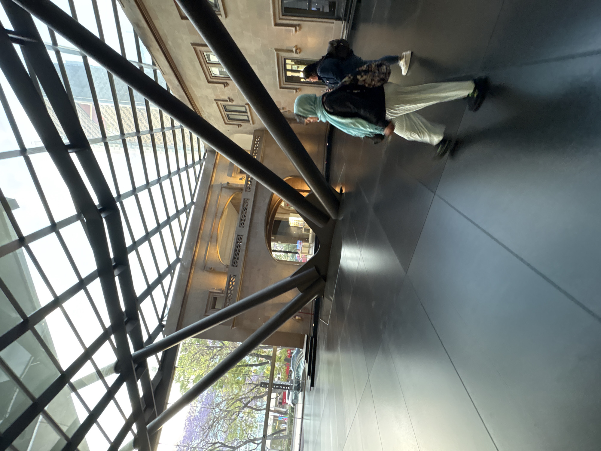 A horizontal shot depicts two individuals in Mexico City, Mexico, as seen through a glass ceiling and structural steel supports. A person wearing a light blue hijab is walking towards the right, and behind them is another person wearing a jacket and backpack. Both are facing the same direction. The setting appears to be inside a building, with a tiled floor and architectural elements visible in the background. Outside, trees with purple blossoms are apparent. The overall impression is of an urban environment with a blend of modern and classical architecture.