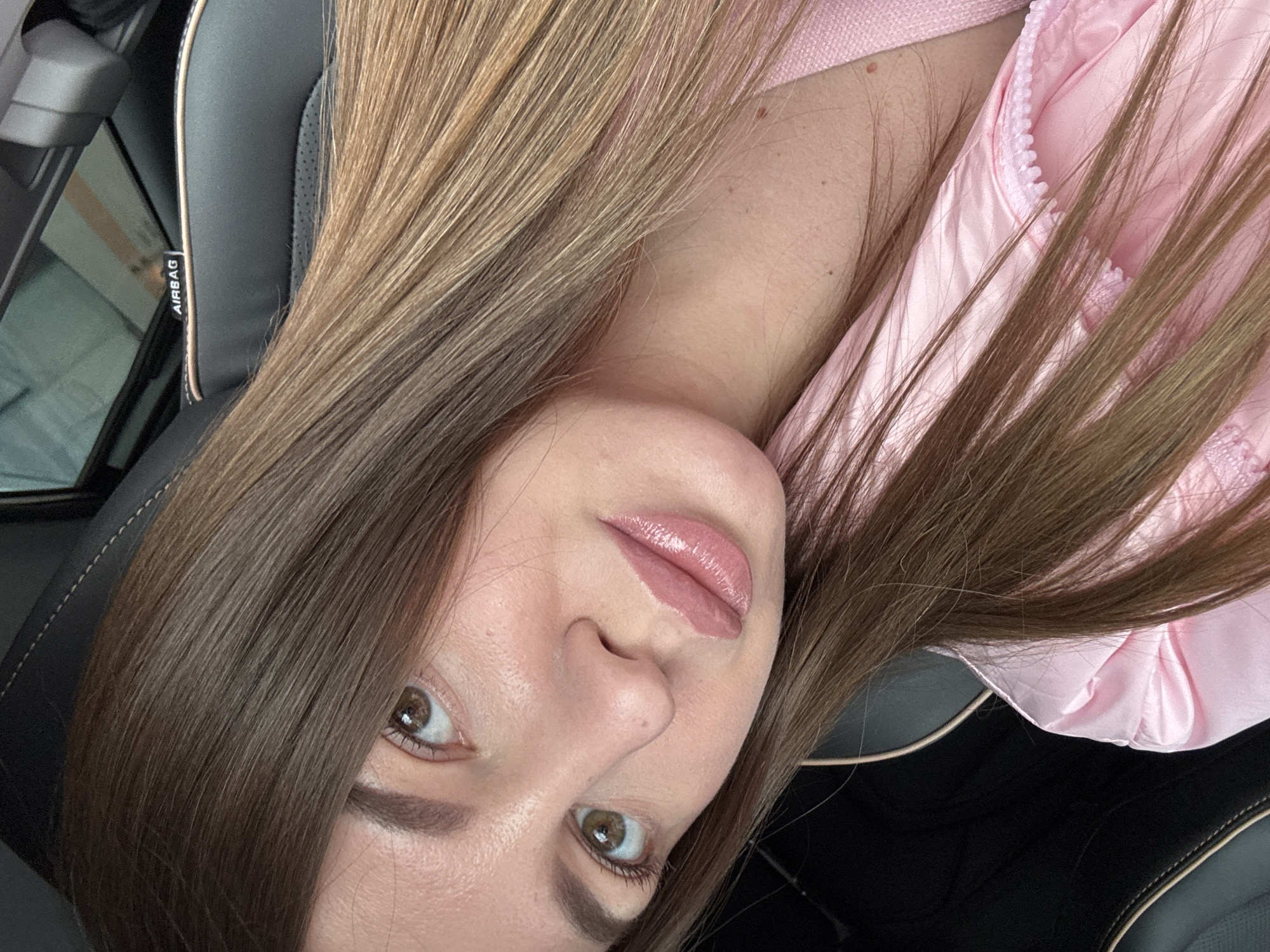 The image displays a close-up, angled portrait of a female subject located within a vehicle. The woman has long, straight brown hair with lighter highlights, fair skin, and brown eyes, with her lips appearing glossed. She is wearing a pink, satin-like collared garment, partially revealing zipper details on the right side of the frame. The background consists of a black car interior, including a car seat with light stitching and an "AIRBAG" label visible on the upper right, confirming the automotive environment. The subject's gaze is directed towards the camera. There are no discernible visual elements within the image to identify the specific city of Orekhovo-Zuyevo, Russia.