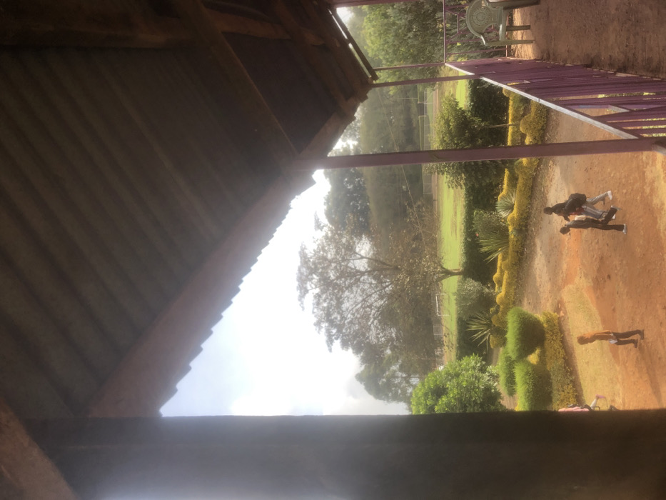 n exterior view from under a metal roof structure. A fenced yard with a green field is visible beyond. People walk on a dirt path bordering manicured shrubbery. A tree stands prominently in the center. The sky is overcast, creating diffused lighting. A chair is partially visible at the top right, suggesting a porch or patio area.