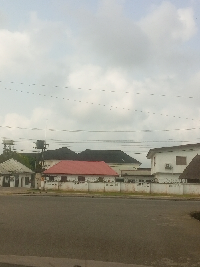 This image depicts an urban street scene in Uyo, Nigeria, under an overcast sky. A dark gray asphalt road occupies the foreground, running horizontally across the frame. Beyond the road, a low, white perimeter wall with decorative rectangular cutouts separates the street from several properties. This wall is topped with what appears to be razor wire or barbed wire. Behind the wall, from left to right: On the far left, a light-colored, single-story building with a grey gabled roof is visible, possibly a gatehouse. Behind it, a tall metal tower supports a water tank. Further back, green foliage and the dark roofs of larger buildings are partially discernible. In the mid-ground, a prominent, single-story building with white walls and a distinct red gabled roof is centered behind the perimeter wall. To the right of the red-roofed building, a two-story white building is visible. It features a brown-framed window on its upper level and an external air conditioning unit mounted below the window. To the right of this building, a portion of a structure with a dark, possibly thatched roof is visible. In the background, behind the primary structures, multiple larger buildings with dark-colored roofs are partially visible. Another elevated water tank on a metal stand is present towards the left background. No people are visible in the scene. The lighting is diffused, indicating an overcast day.