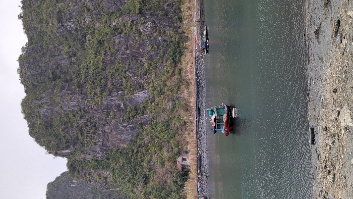 The image displays a coastal environment in Ha Tu Ward, Vietnam, under an overcast, light grey sky. In the foreground, a dark, rocky, and muddy shoreline stretches across the bottom, featuring scattered debris including a partially submerged black tire. The midground consists of calm, dark green-grey water with visible ripples. Two traditional-style fishing boats are present on the water. The primary boat, positioned left of center, features a red hull, a blue-green cabin structure, and a mast, with a white buoy floating next to its hull. Further to the right and closer to the far bank, a second, smaller fishing boat, similarly colored red and blue-green, is visible, displaying a Vietnamese flag on its stern. Behind the water, a narrow strip of land forms a bank at the base of the mountains. On this bank, towards the left, stands a small, single-story house with a light-colored exterior and a dark roof, surrounded by dry, sparse vegetation and tall grasses. A dark, possibly paved or dirt, path or low retaining wall runs along this bank. The background is dominated by towering, rugged limestone karsts, heavily vegetated with dense green foliage, trees, and shrubs clinging to their steep grey rock faces. No individuals are visible within the scene, and the boats appear stationary.