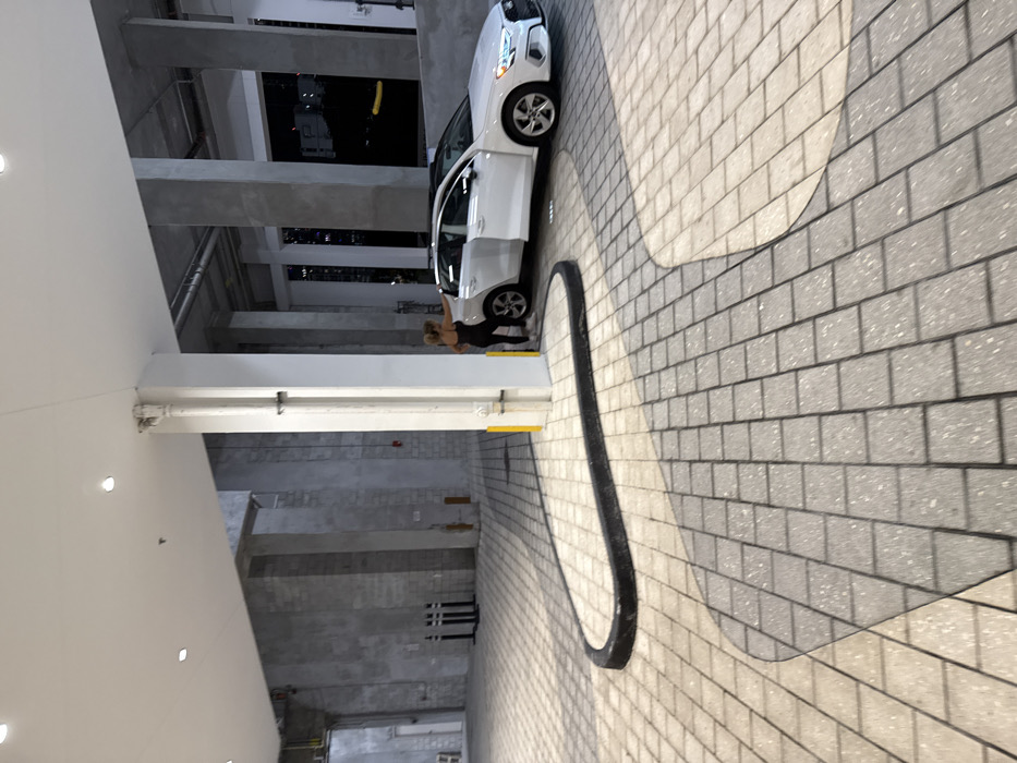 contemporary urban setting, likely an entrance or parking area of a residential or commercial building in Miami, United States of America, during nighttime