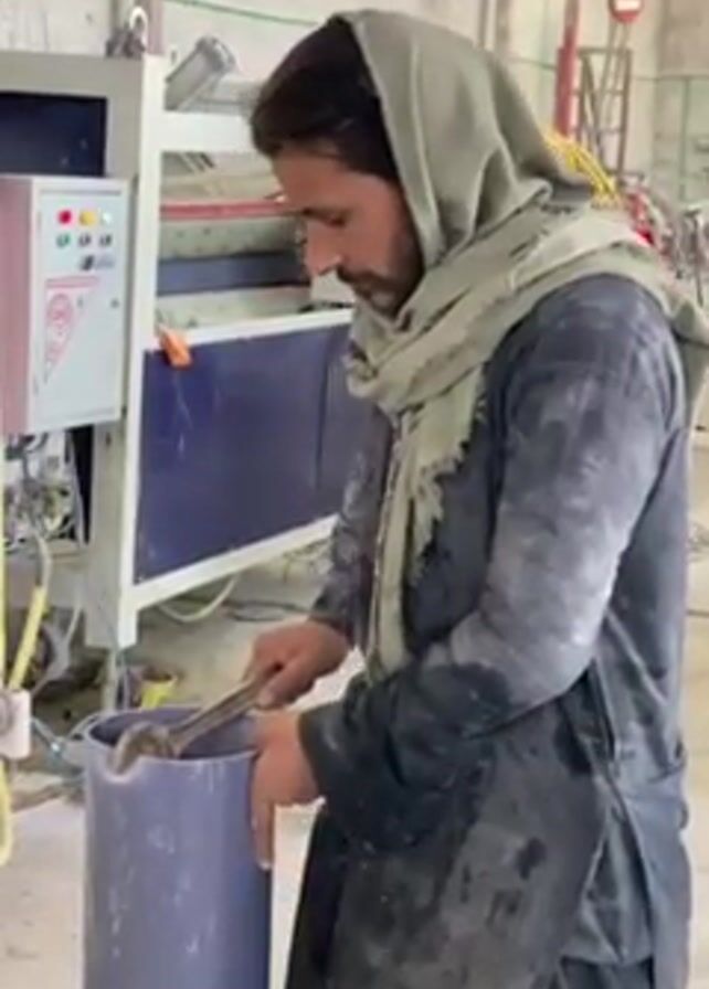 Here is a detailed description of the video: A man stands indoors, operating equipment. He is light-skinned with dark hair and a trimmed beard. He wears a grey headscarf and a dark, paint-splattered overall. He uses a tool, possibly a wrench, to interact with the interior of a large grey plastic pipe, which he holds with his left hand. Behind him is a machine with a blue and white color scheme, featuring indicator lights on a control panel. Yellow cables and hoses are visible connecting to the machine. In the background are blurred elements, including what appears to be a scaffolding-like structure and additional machinery. The environment appears to be a manufacturing or workshop setting.