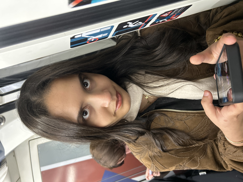 A young woman with long, dark hair is in an enclosed public space, possibly a train or bus
