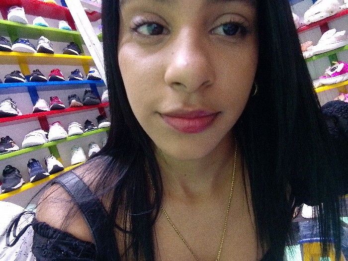 A close-up image depicts a young female in an indoor retail establishment, identified as a shoe store, in Porlamar, Venezuela. The female, centered in the frame, possesses a light-brown complexion, dark eyes, and long, straight dark hair worn down. She is wearing a black off-the-shoulder top, a visible thin gold chain necklace, and a small gold hoop earring in her right ear. Her lips are closed and adorned with pink lipstick. She gazes directly forward, indicating a posed shot or selfie. The background features a multi-tiered display system composed of shelves in vibrant colors including red, blue, green, and yellow. These shelves are stocked with numerous pairs of athletic and casual shoes, predominantly in white, black, blue, pink, and grey, arranged in an organized manner. The scene is illuminated by uniform overhead lighting characteristic of a retail setting.