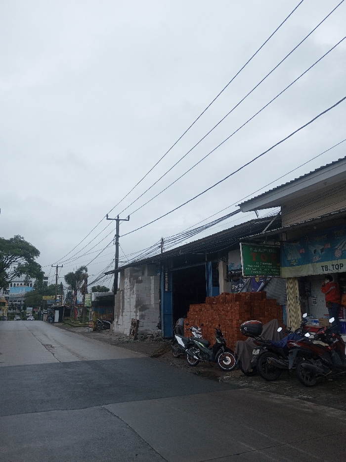 The image displays an urban street scene in Babaliya Mal., India, under an overcast sky. The asphalt road in the foreground appears damp. Along the right side, a series of single-story commercial buildings are present. The first building features a stack of reddish-brown bricks and several grey concrete blocks outside, adjacent to an open blue doorway. A dark-clad individual is partially visible near this doorway. Further right, a shop displays a prominent green sign with fragmented text, including "TB. TQP," above its open entrance. Inside this shop, one individual wearing an orange shirt and a light-colored face mask is standing near merchandise. A row of at least four motorcycles, including one white and black scooter, is parked along the curb in front of these shops. On the left side of the street, a multi-story white building with distinct architectural features is visible in the distance, partially obscured by green trees. Multiple utility poles with extensive overhead electrical and communication wires crisscross the upper portion of the frame. No discernible traffic is present on the visible road section.
