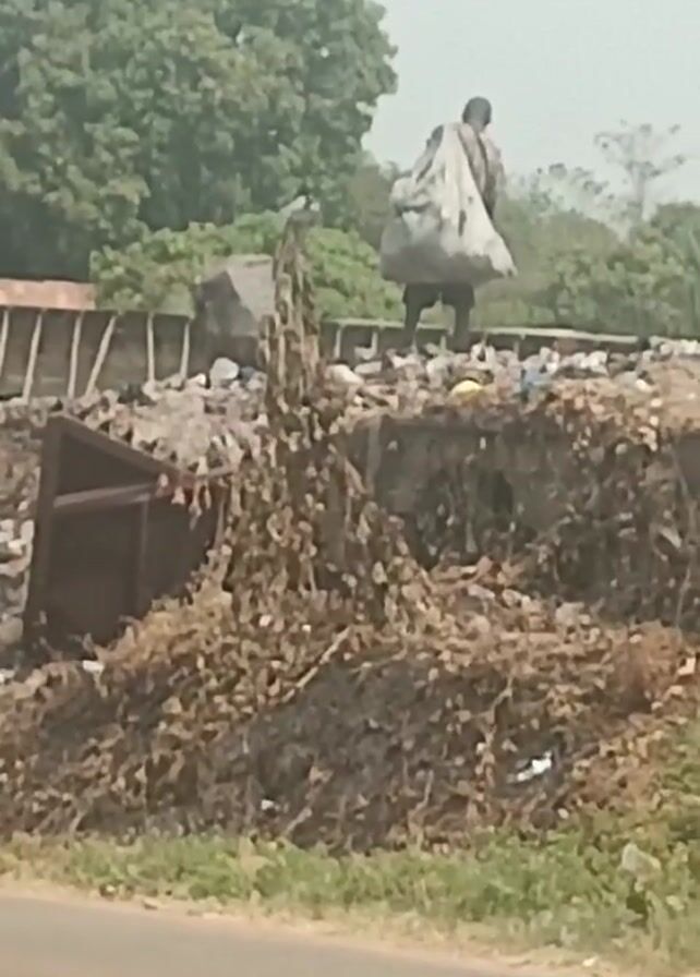 A person is standing on top of a large pile of trash with a large bag slung over their shoulder. A motorcyclist passes in the foreground. The trash pile is next to a road with green trees in the background.