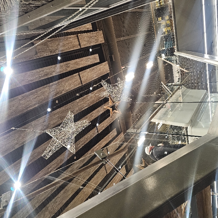 A skewed perspective captures a modern interior, featuring a striking ceiling design of parallel wooden planks alternating with dark spaces. Illuminated star-shaped decorations dangle from thin cables. A glass-encased structure reflects the scene, adding depth and complexity. A metal railing frames the lower right portion of the image. The overall ambiance is bright, enhanced by several light flares that create an ethereal quality.