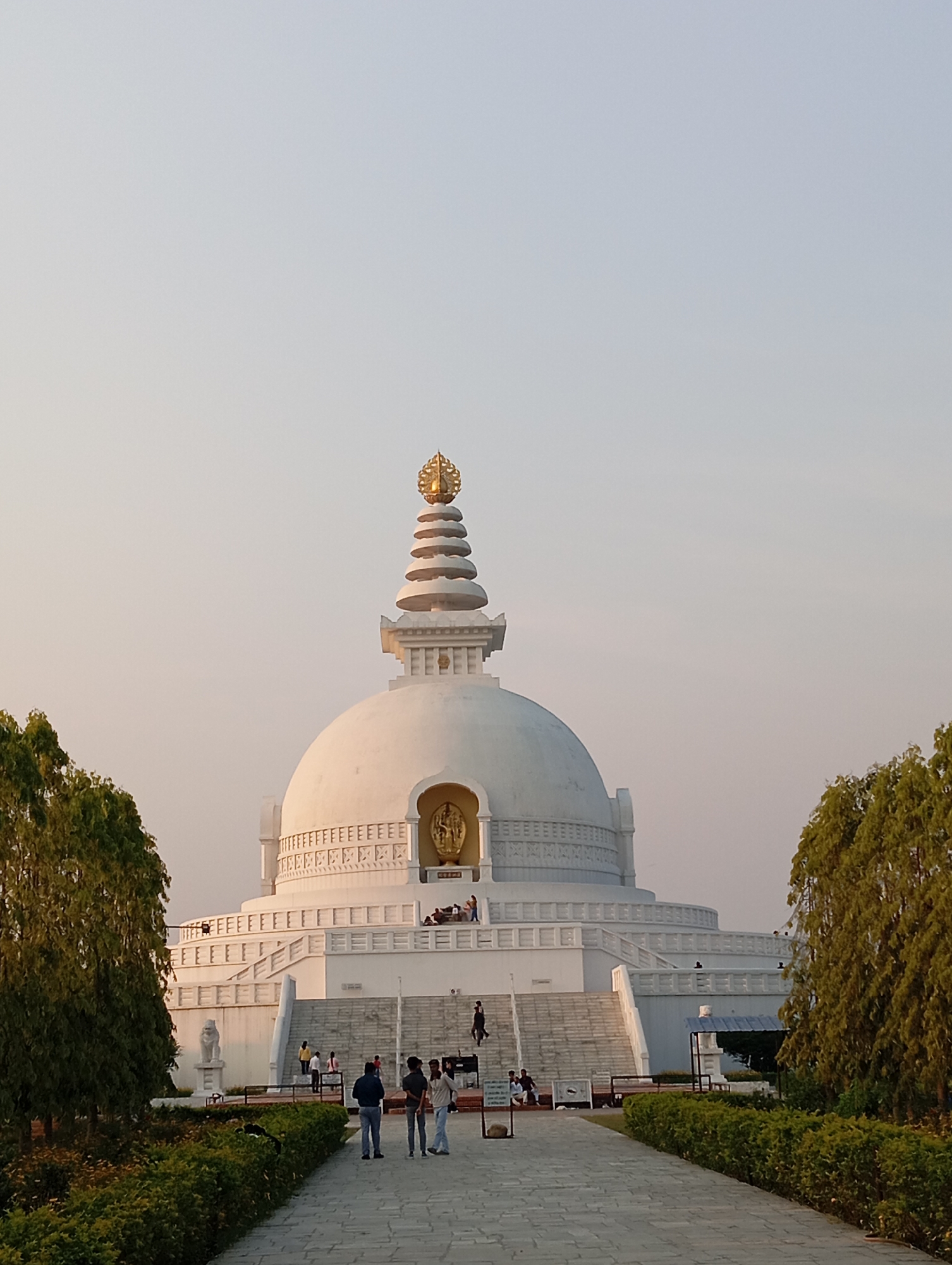 A large, white, multi-tiered Buddhist stupa is prominently depicted, located in Parsa, Nepal. The structure features a large spherical dome, topped with a multi-ringed golden finial. A golden statue of Buddha is recessed within a niche on the dome's facade. The stupa is built upon a wide, terraced base with multiple symmetrical white staircases leading to its upper levels, bordered by balustrades. Decorative geometric patterns are visible on the stupa's architecture. In the foreground, a paved stone walkway extends directly towards the stupa, flanked by manicured green hedges and tall green trees on both sides. Approximately 16 individuals are present: several are walking on the pathway, others are ascending or descending the stupa's staircases, and some are standing on its various platforms, including near the golden statue. A white stone lion sculpture is situated at the base of the stupa on the left. A small structure with a blue roof is partially visible to the right of the pathway. The sky is clear and light, indicating ambient daylight conditions.