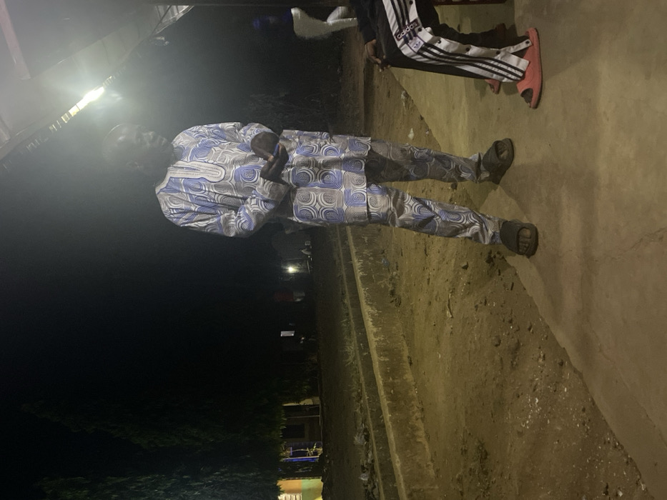 A person in a patterned shirt and pants stands outdoors at night. The scene is dark, with light illuminating the person and the immediate area. Another person wearing Adidas track pants and slides is partially visible. The ground appears to be a mix of dirt and concrete. In the background, dim lights and vague shapes of buildings and trees are discernible.