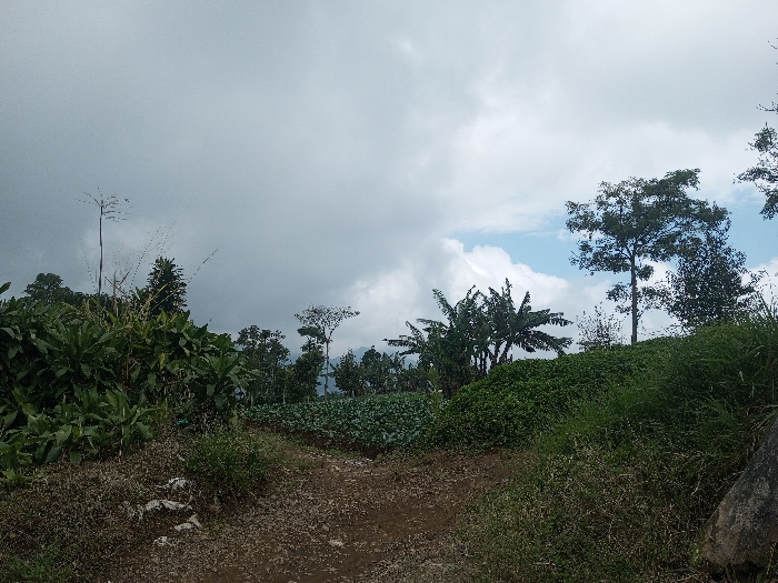 A landscape view shows a path leading upwards towards dense vegetation and trees under a cloudy sky. The path is earthen, and the foreground has sparse vegetation and rocks. To the left are large leafy plants and taller trees. Further ahead, a field of cultivated plants is visible. Banana trees and other trees dot the horizon. The clouds are thick and mostly cover the sky, with patches of blue visible on the right.
