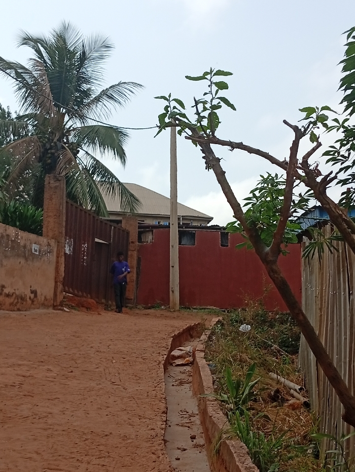 A wide-angle photograph taken in Nsukka, Nigeria, depicts an unpaved, reddish-brown dirt path under an overcast sky. One male individual, wearing a dark blue or purple shirt and dark trousers, walks away from the viewer on the path's left side, approximately mid-frame. A concrete-lined drainage ditch runs parallel to the path on its right. Beyond the ditch, an overgrown strip of vegetation contains dry grass, weeds, and discarded white debris, with sections of what appear to be PVC pipes. A tree with a thick, branched trunk and sparse green foliage extends into the frame from the right. On the left side of the path, a reddish-brown block wall with visible damage and markings transitions into a corrugated metal fence. Opposite, to the right of the path and behind the drainage, a reddish-brown wall with three rectangular openings (possibly windows or vents) is partially visible. A tall, light-colored utility pole stands centrally, positioned between the structures on either side of the path. In the upper-left quadrant, a tall palm tree with visible coconuts among its fronds is present. The light-colored, sloped roof of a building is visible in the upper-center background, above the lower structures.