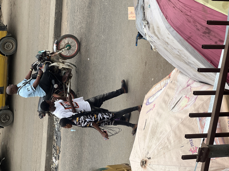 The image depicts a street scene in Egan, Nigeria, observed from an elevated perspective. In the foreground, a rusty brown metal railing with square posts runs horizontally, behind which two large, partially collapsed market umbrellas or tarpaulins rest on the ground. The left umbrella is light beige with faded advertising, including the text "mz" and "RELIEF," alongside an image of hands. The right tarp is mostly white/gray with a section of faded reddish-pink. The central area features a paved, gray asphalt road. Three individuals are moving from left to right. An adult male motorcyclist, bald and wearing glasses, a light blue polo shirt with "24" on the sleeve, dark trousers, and brown shoes, rides a worn white and chrome motorcycle with a black seat and a front wheel featuring red spokes and a green hub. He has a dark bag slung across his chest and a gold-colored bracelet on his right wrist. Slightly ahead of the motorcycle, a male pedestrian with short dark hair walks in a white graphic t-shirt, dark skinny jeans, and dark slip-on sandals. He holds a white object near his face with his left hand. To his left and slightly behind him, a female pedestrian with long dark braids walks in a loose-fitting black, white, and yellow/orange patterned shirt, dark skinny jeans, and light flip-flops. She holds a pink-cased smartphone with dangling headphones in her left hand. A light-colored curb separates the road from a narrow, debris-filled strip on the left. In the background, a portion of a yellow vehicle and part of a green and yellow auto-rickshaw are visible on an adjacent road or section. The overall environment suggests an active urban street with commercial elements.