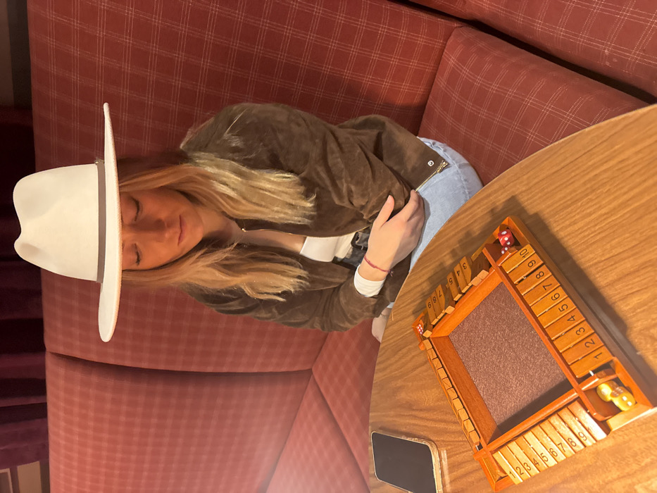 A woman wearing a large white cowboy hat, brown jacket, and blue jeans reclines on a red plaid booth seat. Beside her on a wooden table is a Shut the Box game with wooden tiles numbered 1-10. Two dice and two small yellow pieces are visible on the game. A black rectangular object, possibly a phone, lies at the table's edge. The scene suggests a casual, relaxed atmosphere.
