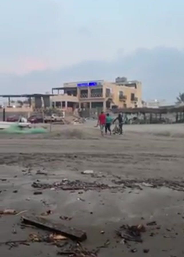 beach with a hotel in the background. The beach is cluttered with debris, including driftwood and trash. There are several small fishing boats scattered along the shore, along with small huts elevated on stilts. Two people are walking on the beach, and a third person is riding a bicycle. The sky is overcast and gray.