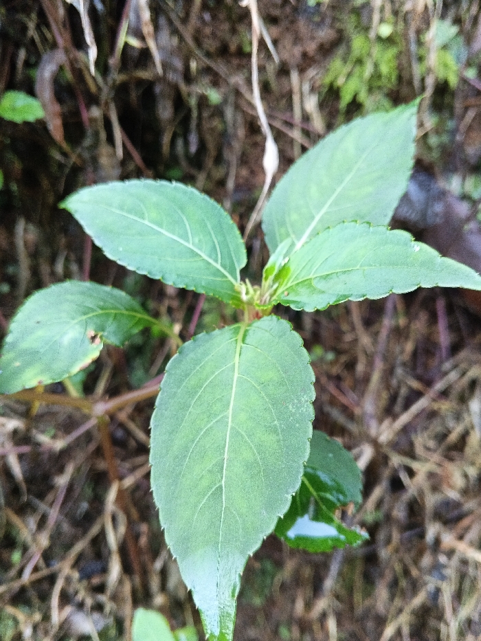 A small plant with vibrant green leaves dominates the frame. The leaves are oval-shaped with serrated edges and prominent veins. The plant's stem is reddish-brown, connecting it to the surrounding dry grass, moss and leaves. The background features blurred out vegetation, including mossy patches and brown plant debris creating a natural setting.