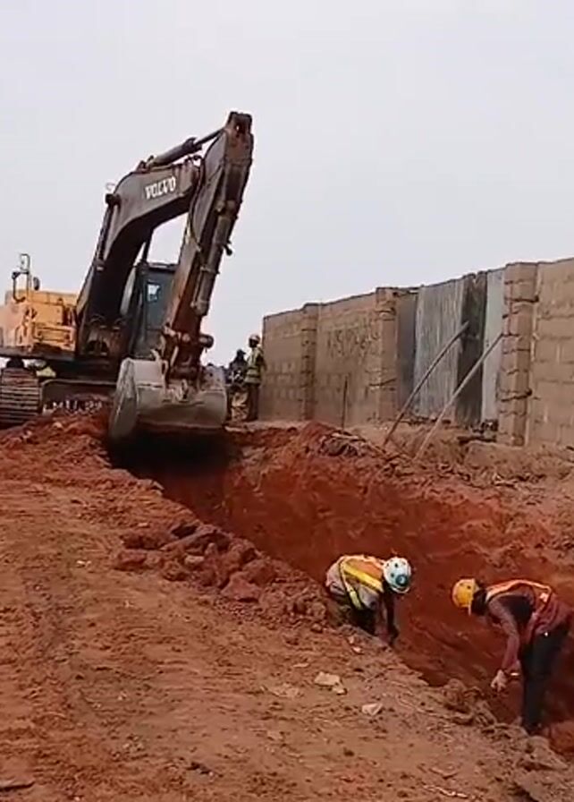 The scene depicts a construction site where an excavator is digging a trench in reddish soil. Two workers wearing hard hats and safety vests are working within the trench with shovels. A dump truck loaded with soil sits nearby, and a crowd of people watches from the edge of the site. A brick wall borders the construction area. The sky is overcast.