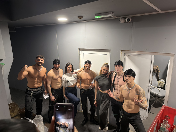 An indoor scene depicts seven individuals, five males and two females, posing for a photograph against a plain grey wall in what appears to be a backstage or utility area. A person, partially visible in the lower left foreground, holds a black smartphone, capturing the group's image, which is visible on the phone's screen. The five males are shirtless, displaying muscular physiques. All wear dark pants and silver chain necklaces. Three of the males wear black durags covering their hair. - The male on the far left of the group has a short beard, is smiling, and flexes his right bicep. - The second male from the left, wearing a durag, has a beard and smiles. - The third male, also wearing a durag, smiles and holds a small clear bottle in his left hand. - The fourth male, wearing a durag, has tattoos on his left arm and chest, a beard, and has his right arm around the shoulder of the adjacent male. - The fifth male on the far right, also with a durag, displays tattoos on his chest and both arms, and holds both hands up with open palms in a relaxed gesture. The two females are positioned within the group of males. - The first female from the left has long dark hair, smiles, and wears a white crop top with a dark logo and dark jeans. Her right arm rests on the shoulder of the male next to her. - The second female from the left has long blonde hair tied back, smiles, and wears a dark grey sleeveless crop top and dark grey wide-leg pants. Her left arm is around the waist of the male beside her. The environment features a dark grey ceiling with a long fluorescent light fixture and two security cameras (one dome, one bullet-style). Two white doors are visible in the background; the one on the right is open, revealing a glimpse of an interior room containing a beige office chair. In the lower right foreground, a red plastic crate holds several clear glass bottles. A large clear plastic water jug is visible in the lower left foreground. The specific location within the city of Varna, Bulgaria, cannot be determined from the visual information provided in the image.