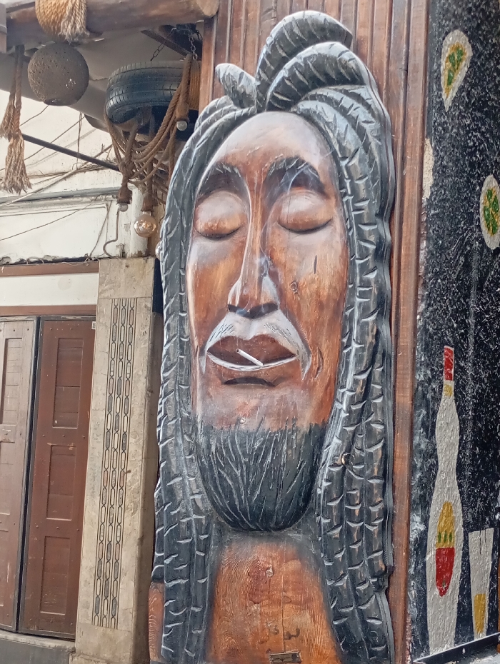 The image displays a large, carved wooden bust, approximately one meter in height, affixed to a building facade in the city of Damascus, Syria. The bust depicts a male figure with a medium brown complexion, closed eyes, a textured beard, and prominent dark dreadlocks. A white cigarette is positioned within the open mouth of the carving. To the left of the carving, a vertical segment of light-colored wall features a repeating geometric pattern, bordering a set of dark brown wooden double doors. Above this section, a wooden beam serves as an overhang. Suspended from this beam are various decorative items: several spheres woven from thick rope, a black car tire, and multiple exposed incandescent lightbulbs connected by visible electrical wiring. To the right of the carving, a dark, textured wall section is visible, adorned with painted motifs. These include several stylized green and yellow organic shapes in the upper portion. In the lower right, a white bottle with red and yellow details is painted alongside a white glass containing yellow liquid.