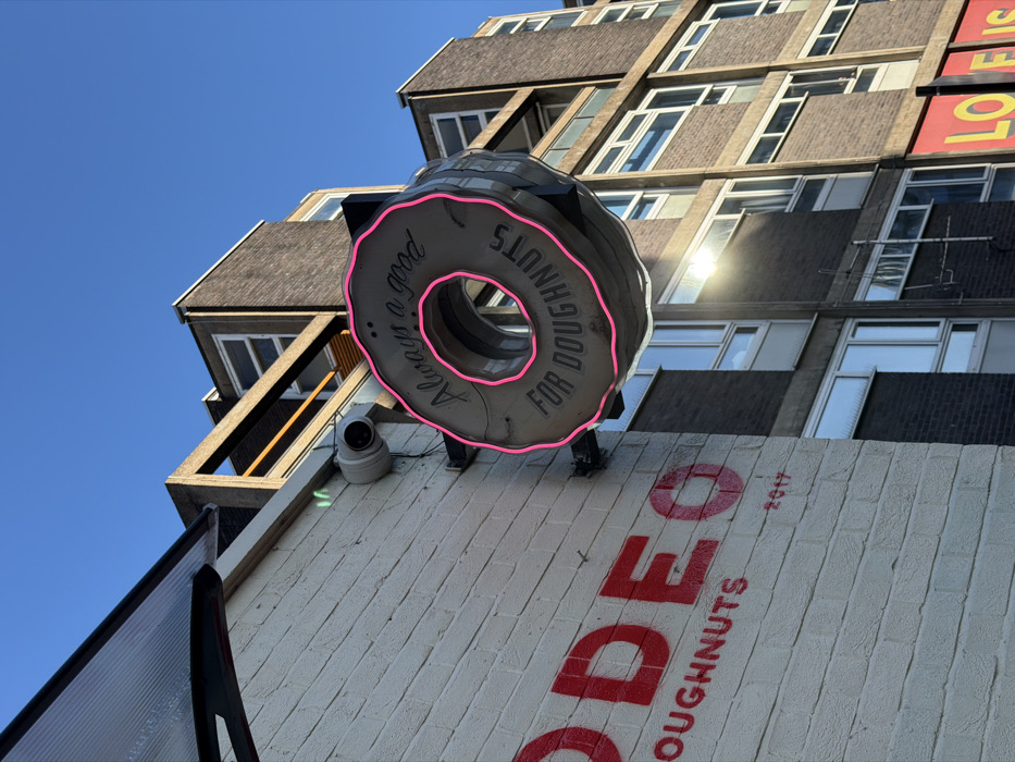 This image depicts the exterior of a building in London, United Kingdom, under a clear blue sky. A large, three-dimensional circular sign, shaped like a donut with a pink neon outline, is mounted perpendicularly to a white brick wall. The sign displays the text "Always a good FOR DOUGHNUTS" in raised lettering. To the left of this sign, on the white brick wall, red stenciled text partially reads "RODEO DOUGHNUTS" and "2017". A white dome-shaped security camera is affixed to the wall above the donut sign. A clear corrugated awning extends from the upper left corner of the image, attached to the same wall. In the background, a multi-story building with dark brick facades and numerous rectangular windows is visible, reflecting sunlight, which creates a lens flare. No individuals are present.