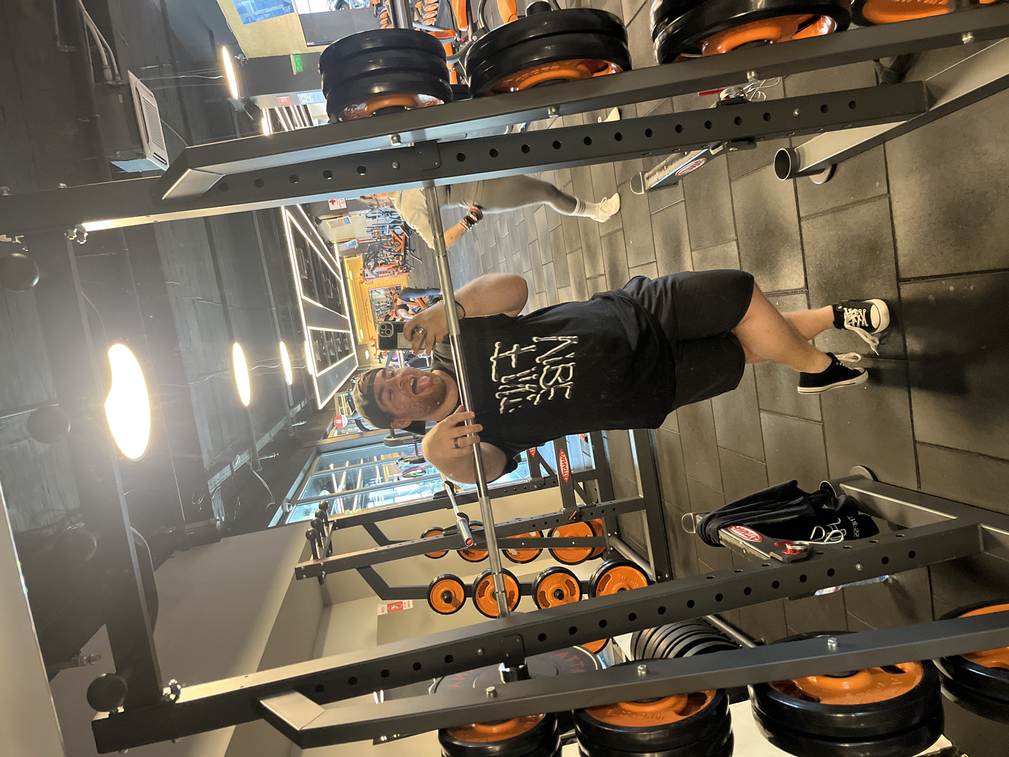A man is taking a selfie with a mobile phone in a gym. He is standing between two weightlifting racks, grasping the metal bars of one. The racks are loaded with black and orange weight plates. He is wearing a black t-shirt and shorts, and sneakers. In the background, there is another person in workout clothes. The gym appears to be modern and well-lit. The location is Pernik, Bulgaria.