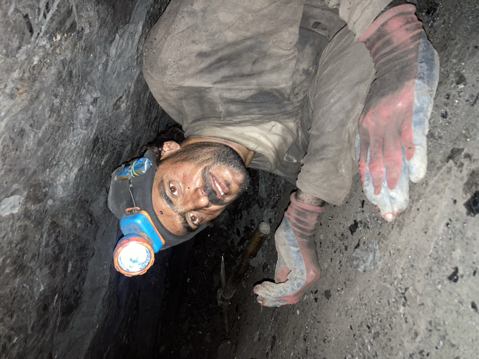 A disoriented perspective showcases a coal miner inside a narrow tunnel. His face, illuminated by a headlamp, reveals a grin amidst the grime. He's covered in coal dust. Pink gloves and striped socks are stained grey. A pickaxe leans against the dark, rocky wall nearby. The miner looks directly at the viewer, creating an unsettling, immersive experience of the cramped and challenging work environment.