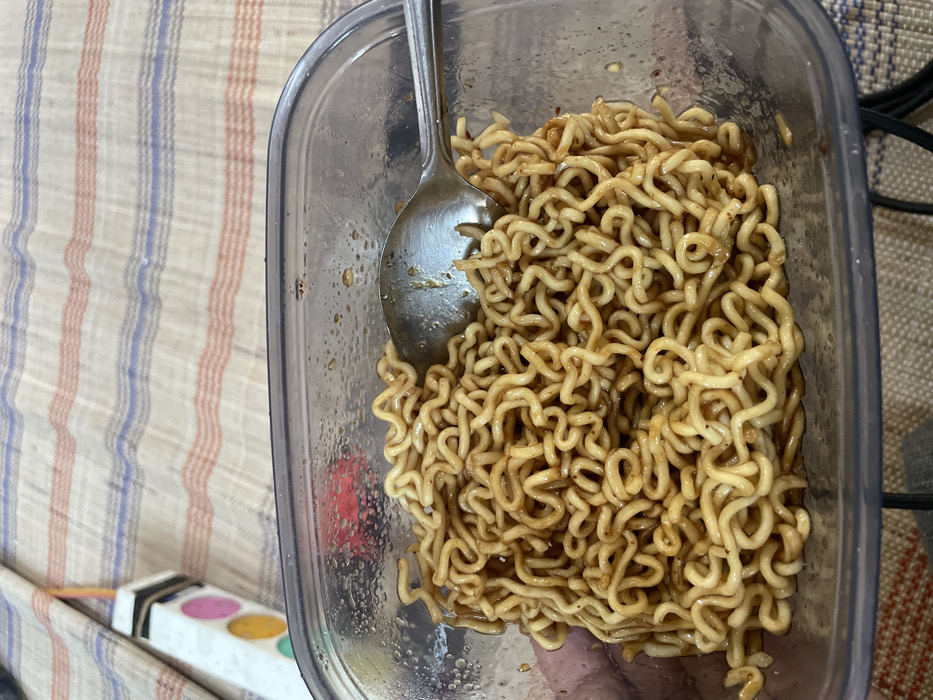 - "A close-up image depicts a clear plastic rectangular food container holding cooked instant noodles coated in a brown sauce, consistent with Indonesian instant fried noodles (Mie Goreng)" by FM-56aBo1, licensed under CC BY 4.0