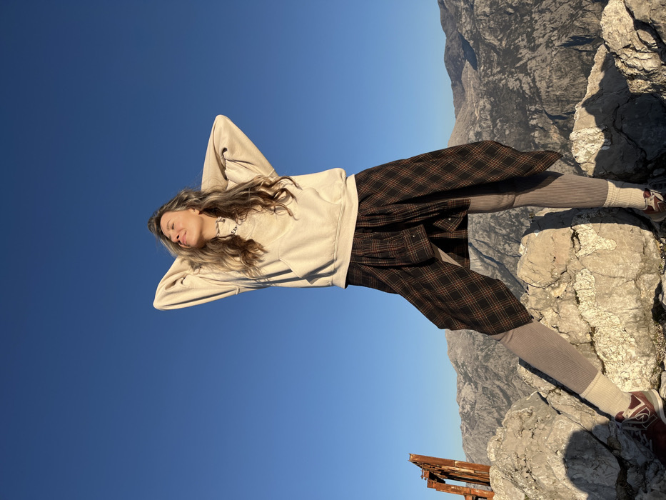 A woman reclines against the azure sky, hands behind her head. She wears a light beige hoodie, a brown and black plaid skirt, tan leggings, white socks, and burgundy hiking shoes. She is on a rocky precipice, with mountainous terrain visible behind her legs. A partly dismantled wooden structure is also nearby.